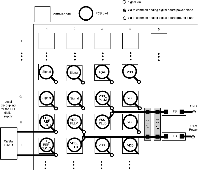 Follow these recommended guidelines to achieve acceptable controller performance for the internal PLL. The DLPC1438 controller contains two internal PLLs which have dedicated analog supplies (VDD_PLLM, VSS_PLLM, VDD_PLLD, and VSS_PLLD). At a minimum, isolate the VDD_PLLx power and VSS_PLLx ground pins using a simple passive filter consisting of two series ferrite beads and two shunt capacitors (to widen the spectrum of noise absorption). It is recommended that one capacitor be 0.1 µF and one be 0.01 µF. Place all four components as close to the controller as possible. It is especially important to keep the leads of the high frequency capacitors as short as possible. Connect both capacitors from VDD_PLLM to VSS_PLLM and VDD_PLLD to VSS_PLLD on the controller side of the ferrite beads.