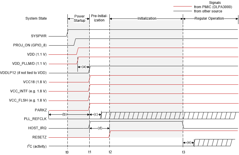 | (c): | It is recommended that SYSPWR not be turned off for 50 ms after PROJ_ON is deasserted (goes low). This time allows the DMD to be parked, the controller to turn off, and the PMIC supplies to shut down. |