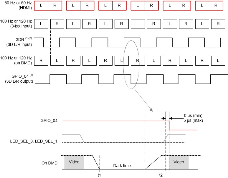 When using DLP Link technology, one light pulse per DMD frame is output from the projection lens while the glasses have both shutters closed. To achieve this, the DLPC34xx tells the DLPAxxxx when to turn on the illumination source (typically LEDs or lasers) so that an encoded light pulse is output once per DMD frame. Because the shutters in the glasses are both off when the pulse is sent, the projector illumination source is also off except when the light is sent to create the pulse. The pulses may use any color; however, due to the transmission property of the eye-glass LCD shutter lenses and the sensitivity of the white-light sensor used on the eye-glasses, it is highly recommended that blue is not used for pulses. Red pulses are the recommended color to use. Figure 7-10 shows 3D timing information. Figure 7-11 and Table 7-6 show the timing for the light pulses when using the DLP Link feature.