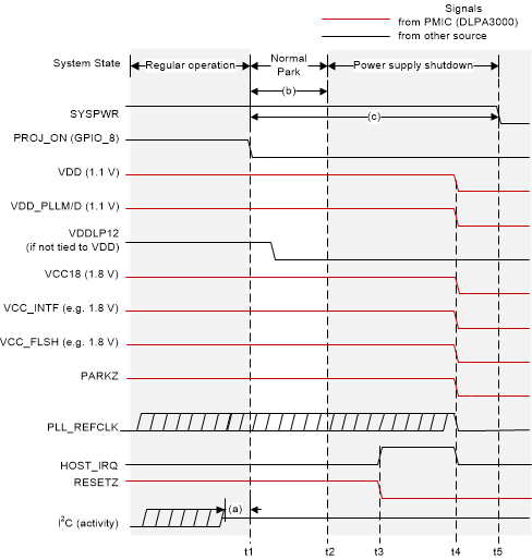 During a Normal Park it is recommended to maintain SYSPWR within specification for at least 50 ms after PROJ_ON goes low. This is to allow the DMD to be parked and the power supply rails to safely power down. After 50 ms, SYSPWR can be turned off. If a DLPA200x is used, it is also recommended that the 1.8-V supply fed into the DLPA200x load switch be maintained within specification for at least 50 ms after PROJ_ON goes low.