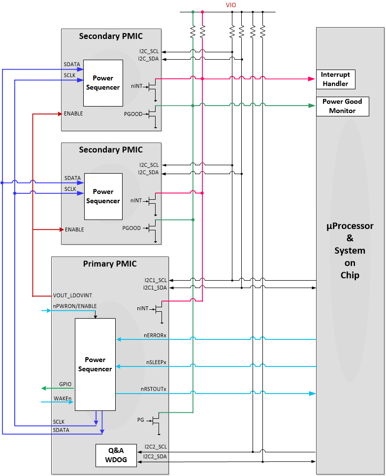 In this scheme, each primary and secondary PMIC runs on its own system clock, and maintains its own register map. Each PMIC monitors its own activities and pulls down the open-drain output of nINT or PGOOD pin when errors are detected. The microprocessor must read the status bits from each PMIC device through the I2C or SPI interface to find out the source of the error that is reported.