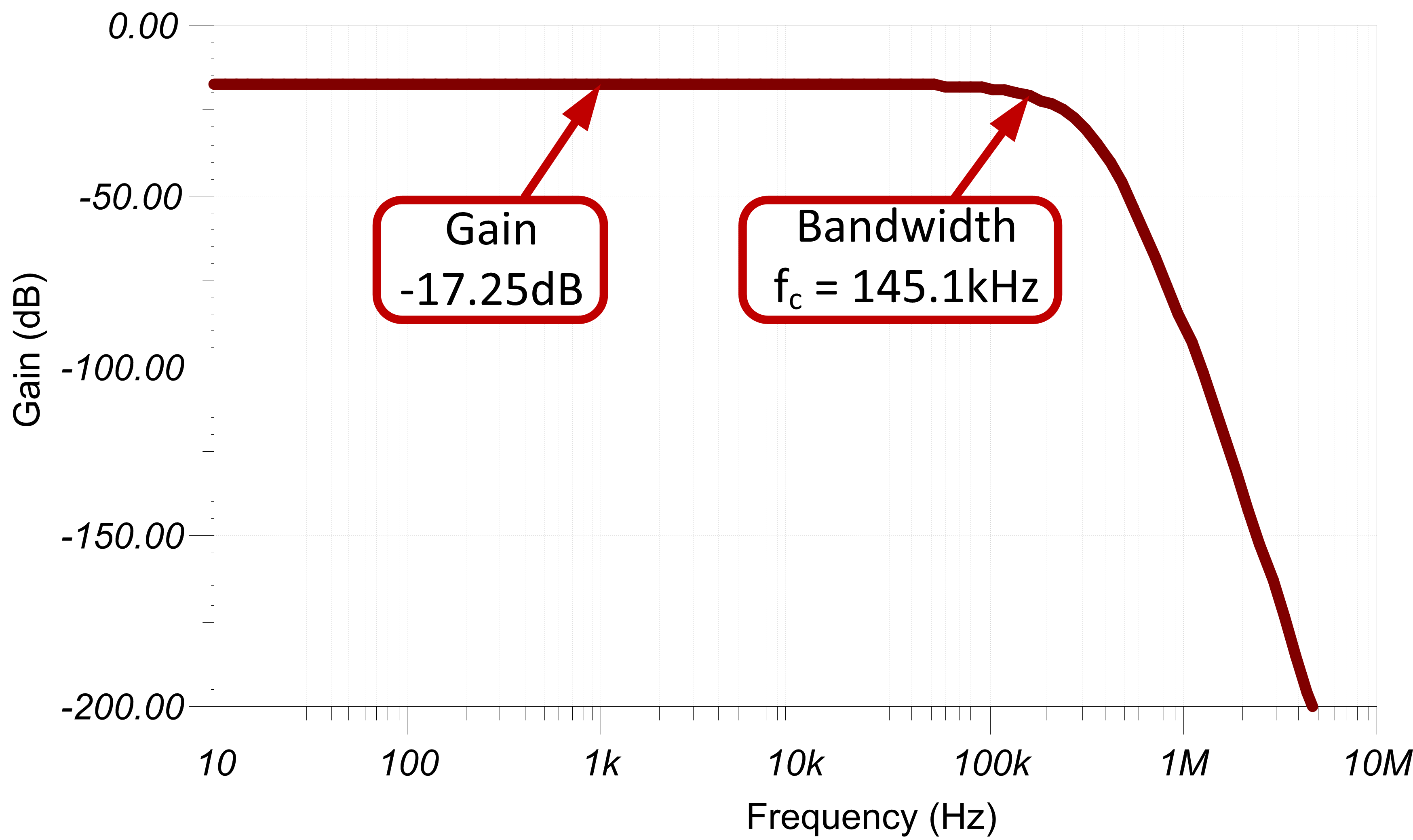 Die simulierte Bandbreite der Signalkette beträgt ca. 145 kHz und die Verstärkung beträgt -17,25 dB, was einer linearen Verstärkung von ca. 0,137 V/V entspricht (Dämpfungsverhältnis 1/7,28 V/V). Dies entspricht der erwarteten Verstärkung des Systems.