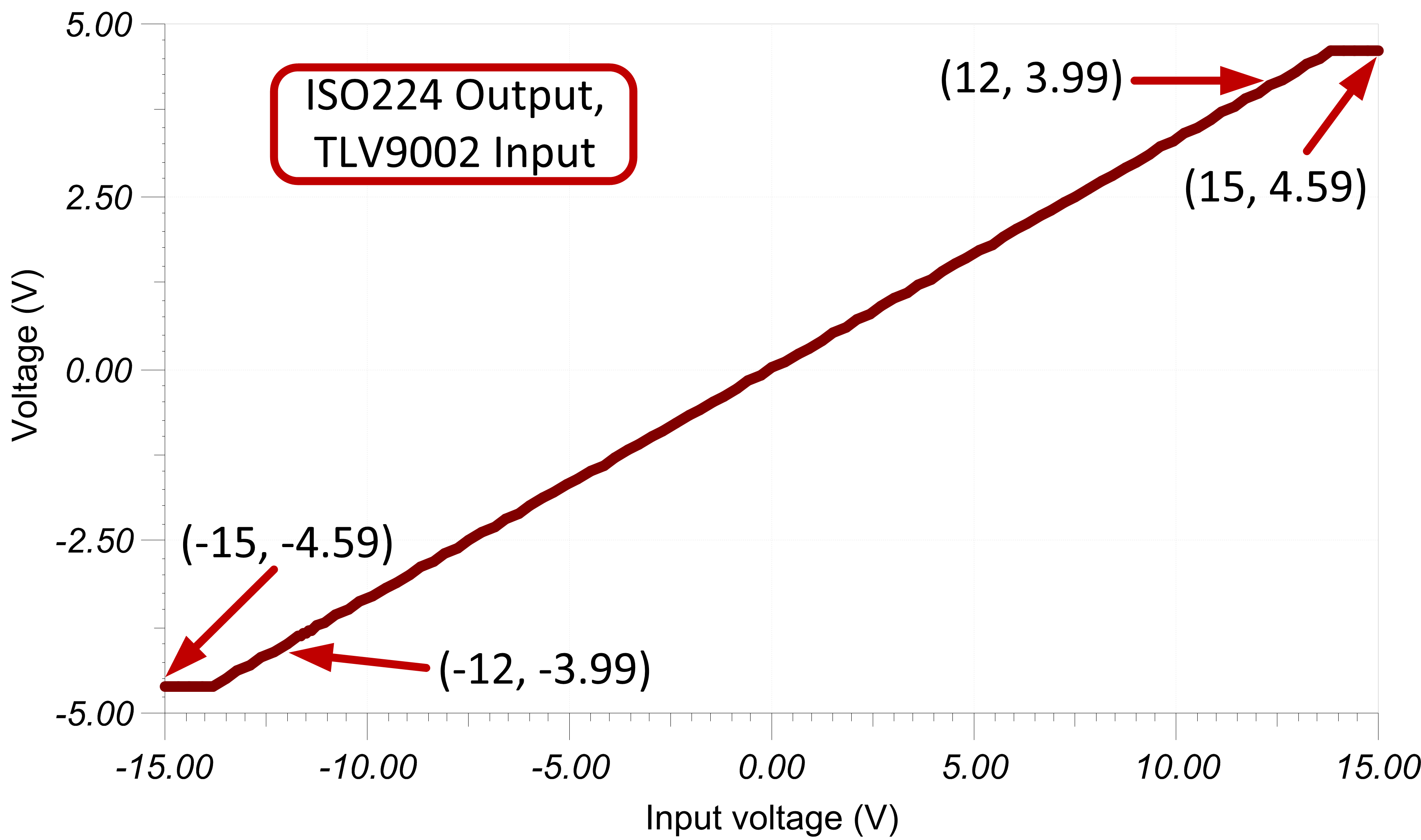 Die folgenden Abbildungen zeigen die simulierten Eingänge des TLV9002 und des ADS7142 von einem ±15 V-Eingangssignal an den ISO224. Der ISO224 hat ein lineares Ausgangssignal von ±VIN / 3. Die Eingangsspannung des TLV9002 ist im ersten Diagramm zu sehen. Das zweite Diagramm zeigt, dass der TLV9002 die Verstärkung um VIN / 2,43 weiter reduziert und den Gleichtakt auf 1,65 V verschiebt. Dies führt zu einem vollständigen Eingangssignal von ±12 V unter Verwendung des Vollausschlagsbereichs (FSR) von 0 V bis 3,3 V des A/D-Wandlers mit AVDD = VREF = 3,3 V.