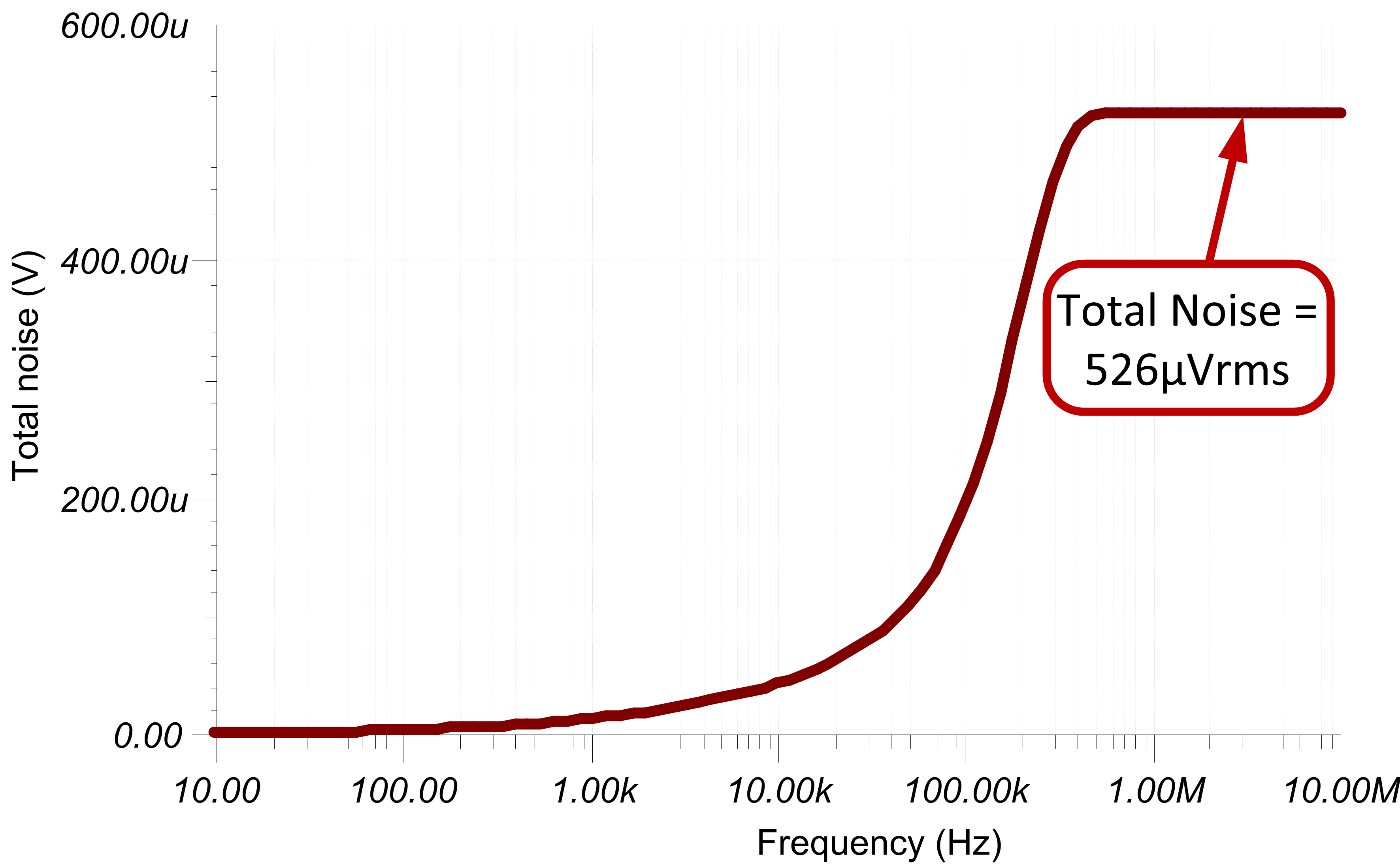 Das simulierte Rauschen am Eingang des A/D-Wandlers ist größer als das erwartete berechnete Rauschen. Der Grund für diesen Unterschied ist eine Rauschüberhöhung im Simulationsmodell, die nicht in der Berechnung enthalten ist. Die folgenden Gleichungen zeigen, dass das Rauschen von ISO224 die Signalkette dominiert und dass das Rauschen von TLV9002 vernachlässigbar ist. Detaillierte Informationen zu diesem Thema finden Sie unter Berechnen des Gesamtrauschens für ADC-Systeme.