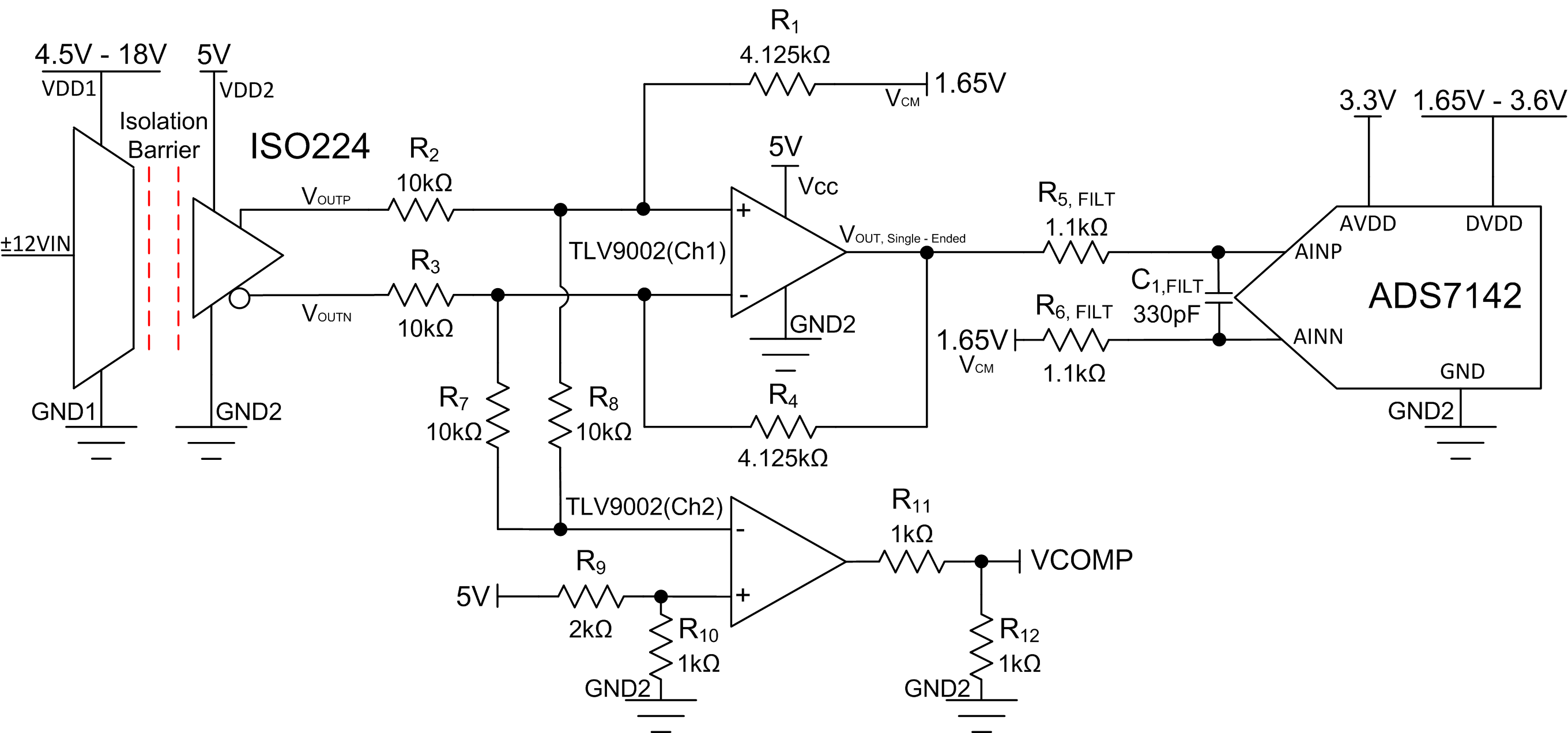 Kanal 2 des TLV9002 wird zur Überwachung der ausfallsicheren Ausgangsfunktion des ISO224 verwendet. Die ausfallsichere ISO224-Ausgangsfunktion wird aktiviert, wenn unabhängig vom Eingangssignal am VIN-Kontakt die High-Side-Stromversorgung (VDD1) fehlt. Der TLV9002-Kanal-2-Ausgang (VCOMP) wird an einen GPIO-Port des Systemcontrollers eingespeist und wird immer dann hochgesetzt, wenn die ausfallsichere Ausgangsfunktion aktiv ist. Weitere Details finden Sie im Anwendungshinweis zur Funktion Fail-Safe Output.