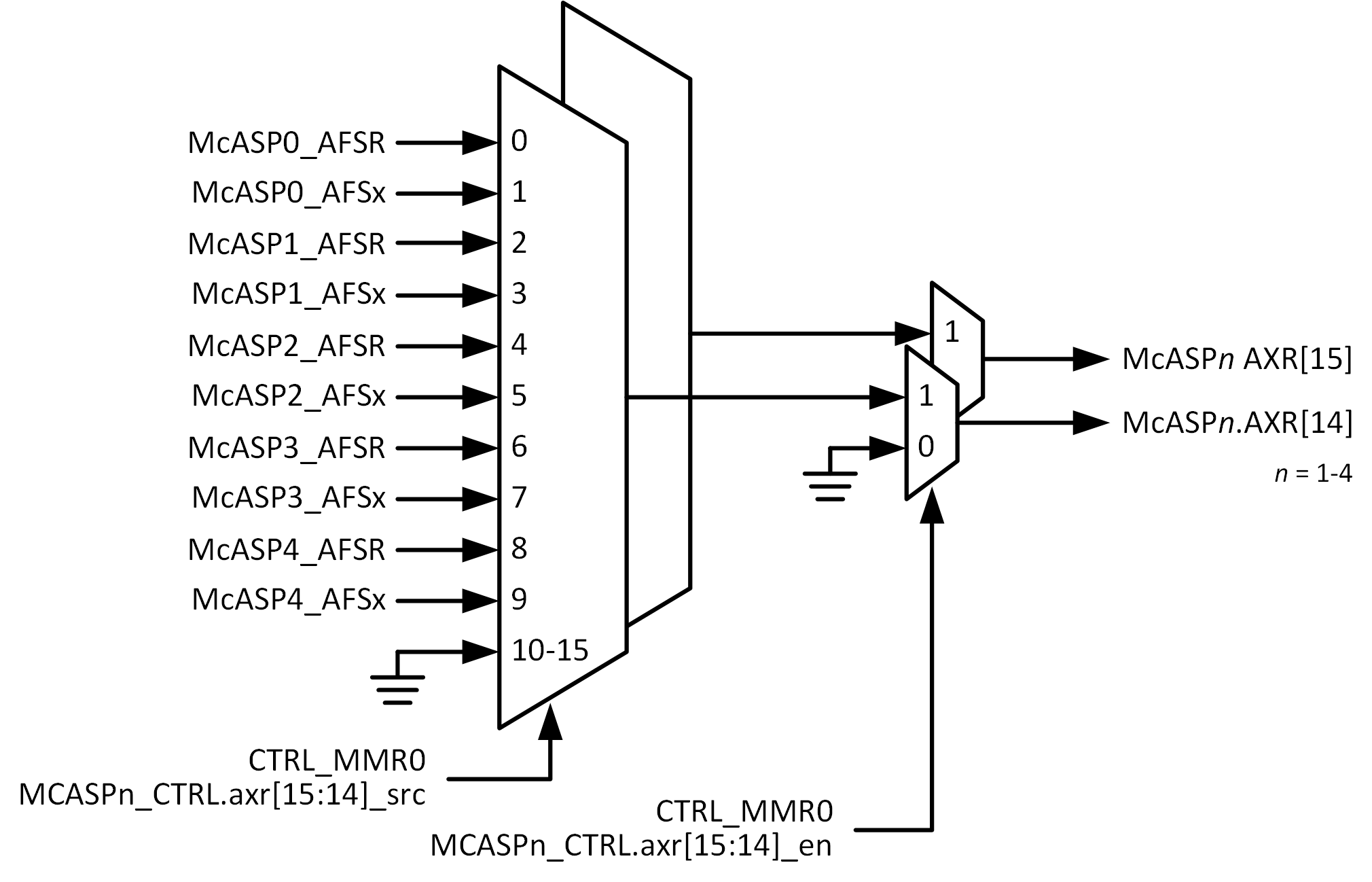 In order to align frame syncs across McASPs that may be feeding DACs with different formats but the same frequency, the frame sync of McASPx can be optionally fed into a receive data pin of McASPy. The device includes a multiplexor to allow any McASP transmit or receive frame syn to be connected to receive channels 14 & 15 of any other McASP: