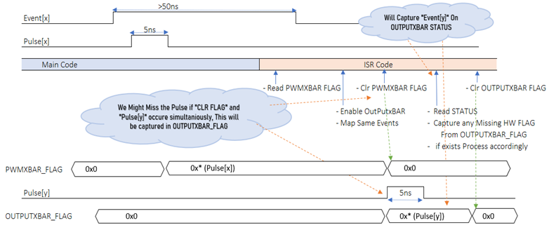 Any missed Hardware event during the same window will be captured in OUTPUTXBAR FLAG”. Read the OUTPUTXBAR FLAG and process accordingly