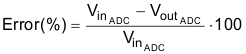 在测量 ADC 电压输入和测量的精度时,我们使用了 ±40V 满量程范围内的不同直流输入值。以下方程式展示了如何计算通过 ADC 读取的模拟电压。FSR 在这里是指系统的满量程范围,在本例中该值为 40V。该方程式中添加了因数 2,因为这是一个双极性输入,其中输入范围实际上为 ±40V(也就是 80V 的范围)。此方程式中的 VoutADC 的范围为 ±40V,对应的是系统输入。