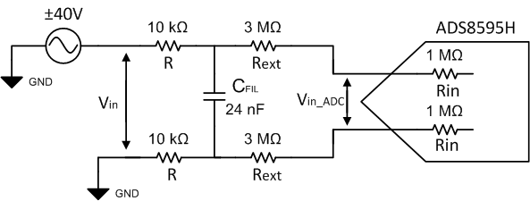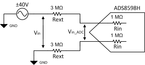 该器件的内部阻抗为 1MΩ,外部电阻器的选择则是基于所需的扩展输入范围 (Vin),在本例中该范围为 ±40V。该外部电阻器会结合该器件的内部阻抗形成一个分压器,将 ADC 输入引脚上的输入电压 (VinADC) 降低至 ±10V 的器件输入范围内。