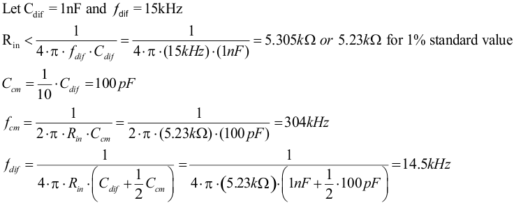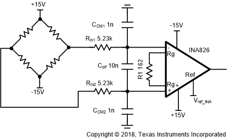 下图显示了常用的仪表放大器输入滤波器。Cdif 过滤差分噪声,而 Ccm1 和 Ccm2 过滤共模噪声。请注意,建议满足 Cdif ≥ 10Ccm 条件。这样可以防止共模噪声由于组件容差而转换为差分噪声。以下滤波器旨在实现 15kHz 的差分截止频率。