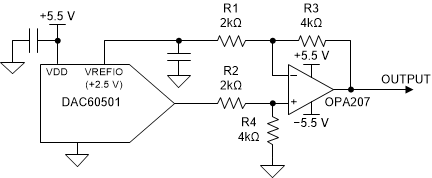 通过利用也具有基准电压的电压输出 DAC 来实现这些设计目标。DAC 输出和基准输出连接到差分放大器,基准电压连接到反相输入。这使得 DAC 的零标度输出能够将放大器的输出设置为其负满标度值。