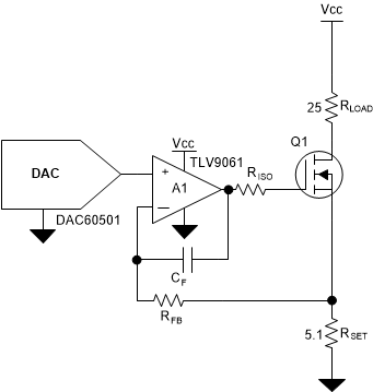 可编程低侧电流阱可根据 DAC 输出电压设置流经负载的电流。可通过 RSET 检测该电流,运算放大器对晶体管进行偏置,以调节流经负载的电流。元件 CF、RISO 和 RFB 可提供补偿,以确保电路的稳定性。