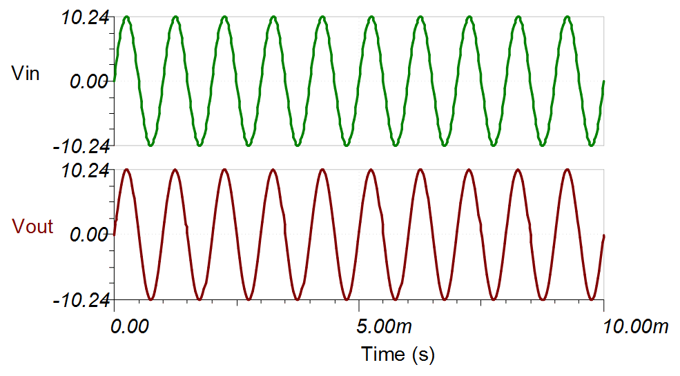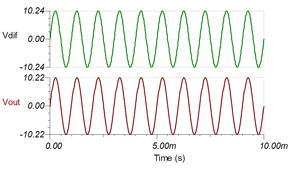 使用 ±10.24V 差分输入和 7.75V 共模电压对 INA828 器件进行了仿真。以下 TINA 仿真显示了 INA828 器件的差分输入和单端输出。