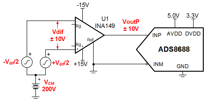 使用 ±10.24V 差分输入和 275V 共模电压对 INA149 器件进行了仿真。以下 TINA 仿真显示了 INA149 器件的差分输入和单端输出。该器件没有 200V 共模电压问题。