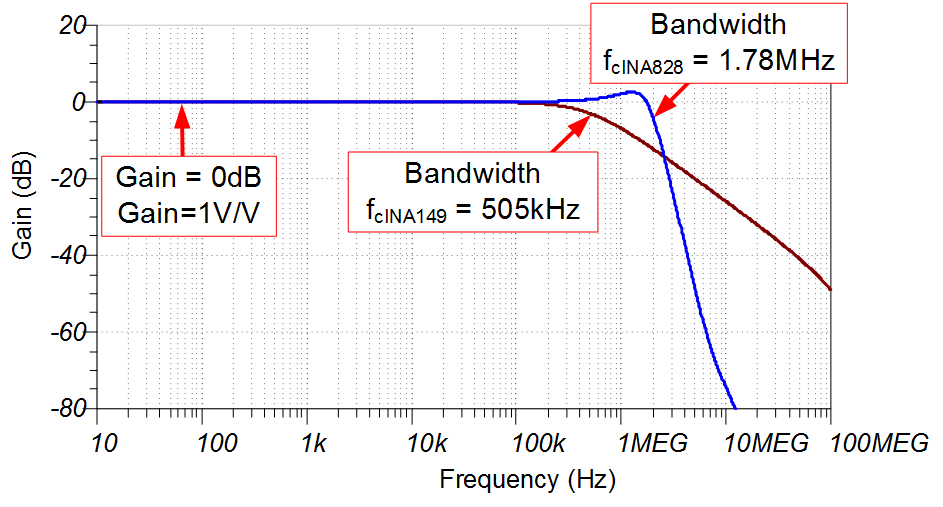 当增益 = 1V/V(或 0dB)时,INA149 器件的仿真带宽是 505kHz。当增益为 0dB 时,INA828 器件的仿真带宽是 1.78MHz。这两个仿真带宽都非常符合各自的数据表。请观看放大器带宽视频系列,了解有关该主题的更多详细信息。