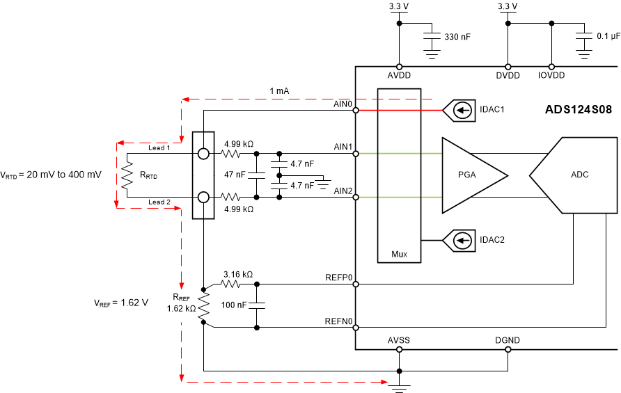 基准电阻器 RREF必须是具有高精度和低漂移的精密电阻器。RREF 中的任何误差都反映了 RTD 测量中的相同误差。所示出的 REFP0 和 REFN0 引脚作为开尔文连接与 RREF 电阻器相连,以获得最佳的基准电压测量值。这消除了作为基准电阻测量误差的一切串联电阻。