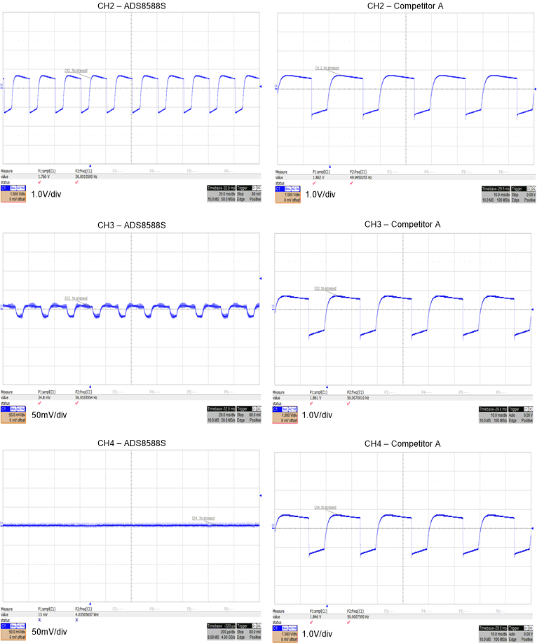 以下几个图采集了在通道 1 上施加 ±30Vpeak (60Vpp) 电气过载信号并且其余通道悬空时的数据。我们使用示波器来测量过压信号到悬空通道的馈通。请注意,对于通道 2,ADS8588S 和竞争对手器件是类似的。在其余通道(CH3 至 CH8)上,ADS8588S 的馈通远小于 TI 器件。这一情况明显表明,对于 ADS8588S,当系统中的一个通道出现过压故障时,具有有效输入信号的通道的运行不会受到显著影响。相反,对于竞争对手器件,所有通道都受到故障的不利影响。请注意,该电路也使用 ±15Vpeak、±18Vpeak、±21Vpeak、±24Vpeak 和 ±27Vpeak 信号进行了测试。正如预期的那样,较大的过载信号会产生最坏情况的结果。