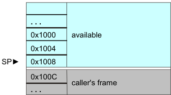 如果此函数需要栈上的一个字来存储某些内容,则需要分配 2 个字的帧(因为 SP 必须始终保持 8 字节对齐)。执行分配的方法是将 SP 递减 8。现在栈如下所示: