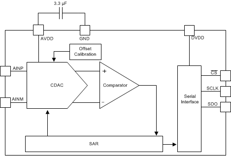 ADS7049-Q1 器件是一款符合汽车类 Q100 标准的 12 位、2MSPS 模数转换器 (ADC)。此器件支持宽范围的模拟输入电压(2.35V 至 3.6V),并且包括一个基于电容器且内置采样保持电路的 SAR ADC。串行外设接口 (SPI) 兼容串口由 CS 和 SCLK 信号控制。输入信号在 CS 下降沿进行采样,SCLK 用于转换和串行数据输出。此器件支持宽范围的数字电源(1.65V 至 3.6V),可直接连接到各类主机控制器。ADS7049-Q1 符合 JESD8-7A 标准的标称 DVDD 范围(1.65V 至 1.95V)。