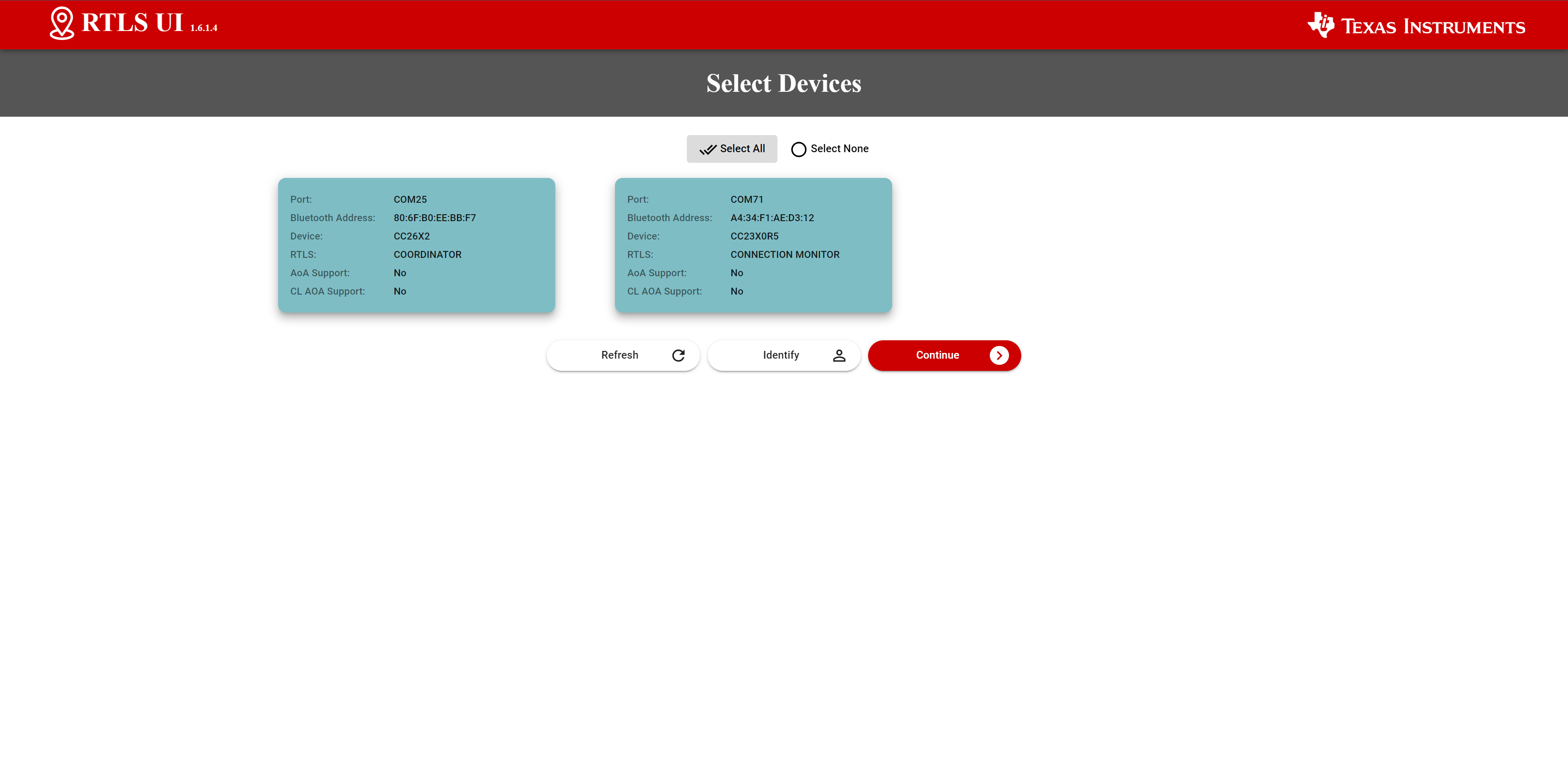 在这里您应该看到连接电脑的 CC2642 和 CC2340,点击 Select All -> Continue进入页面。