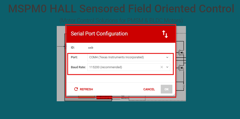 根据 PC 上的已连接端口来配置串行端口,并将波特率配置为 115200。