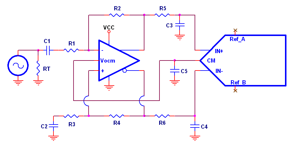 circuit - many people omit it, which can lead to potential problems. Resistors R1 through R4 set the gain of the fully differential op amp. R5, R6, C3, and C4 are ADC compensation components.